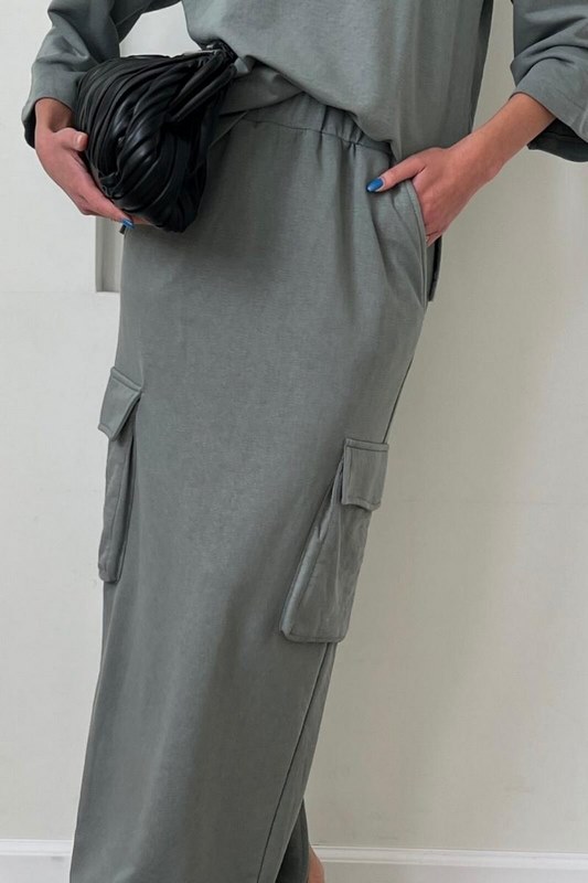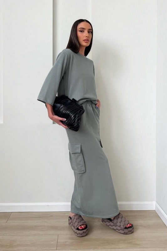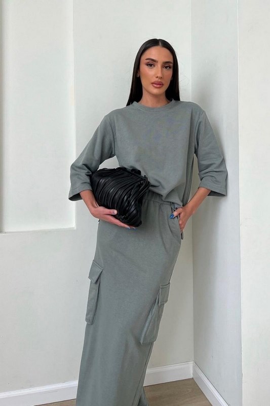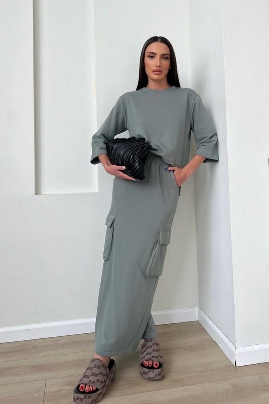 חולצה עם שרוול 3/4 עובר מרפק וחצאית מקסי עם שני כיסים קדמיים בחלק העליון ושני כיסים קדמיים בחלק התחתון, גומי  למעלה ושסע אחורי.