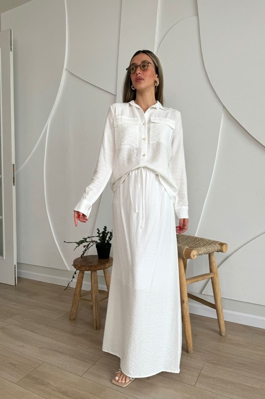 חליפת שני חלקים מבד פשתן, חולצה מכופרת עם שני כיסים ושרוולים ארוכים.
