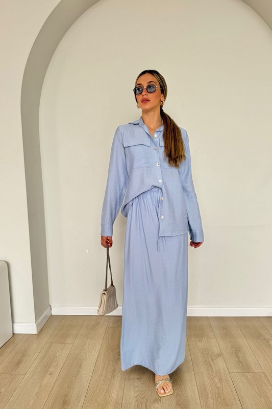 חליפת שני חלקים מבד פשתן, חולצה מכופרת עם שני כיסים ושרוולים ארוכים.