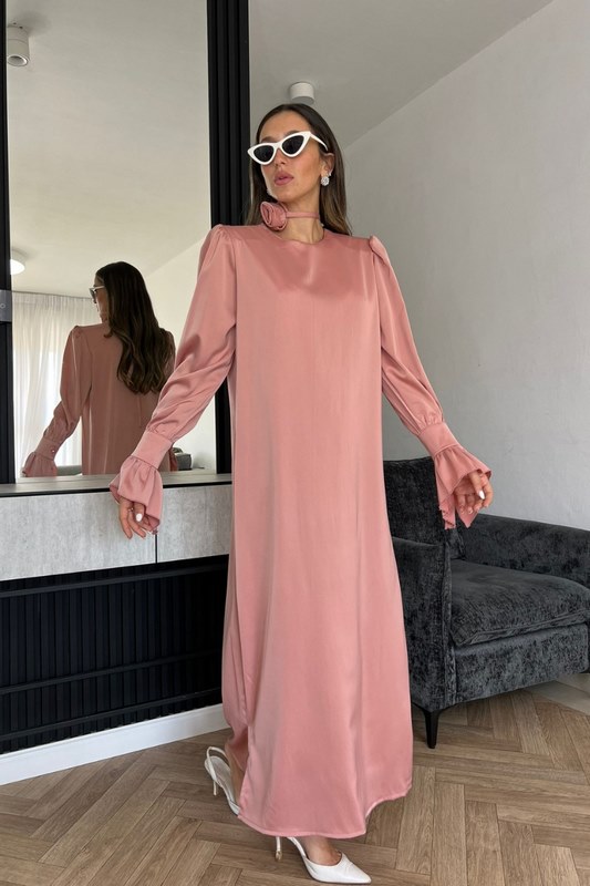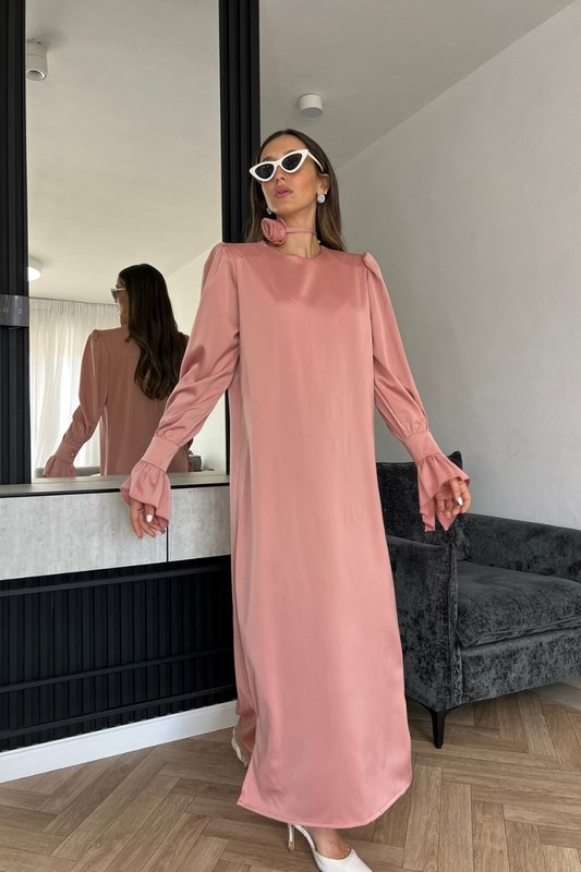 שמלת מקסי מבד משי סאטן, נשפכת על הגוף, בגזרה ישרה קלאסית, שרוולים ארוכים ובסיומת מתרחב.